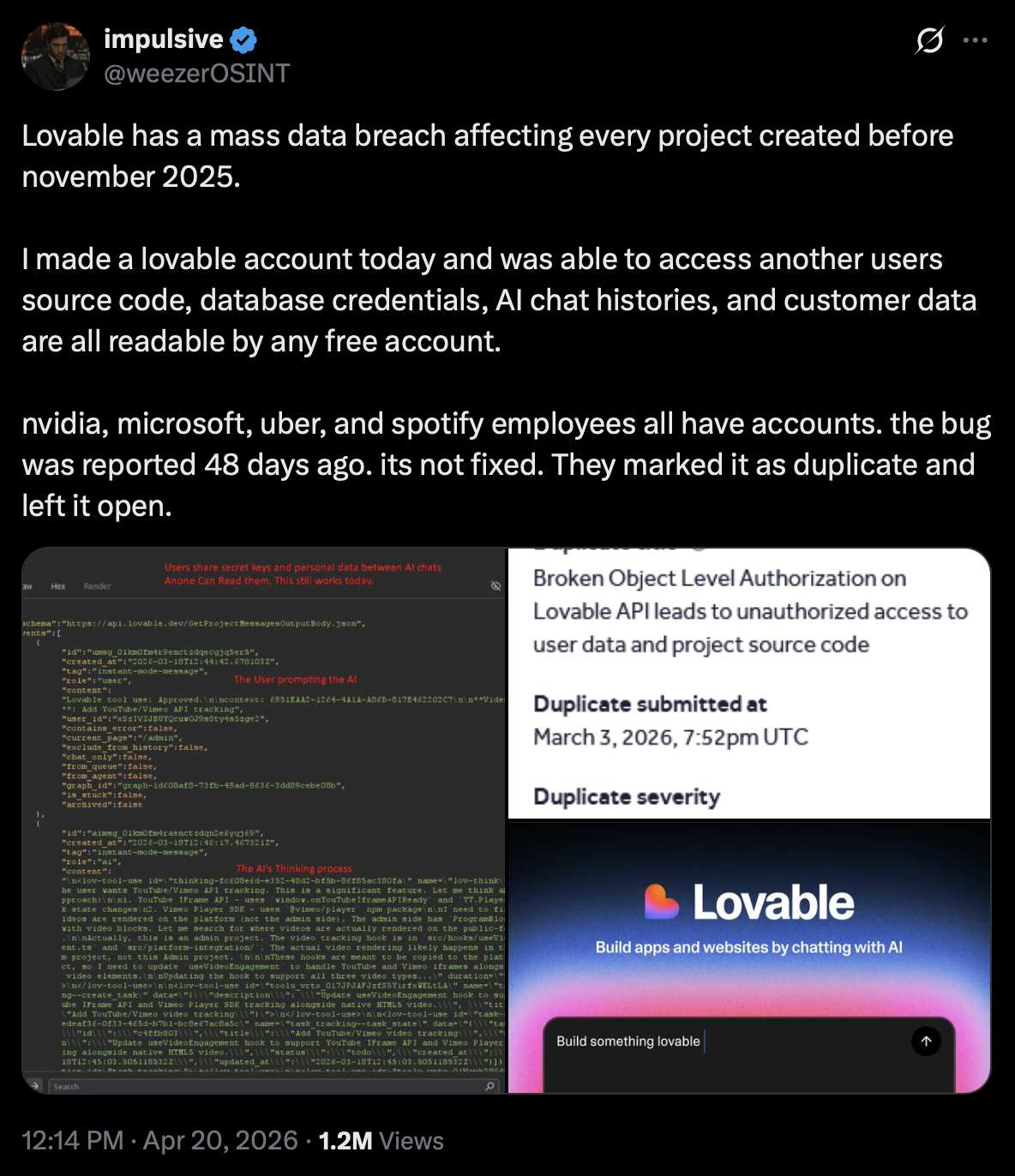 "I made a lovable account today and was able to access another users source code, database credentials, AI chat histories, and customer data are all readable by any free account."
