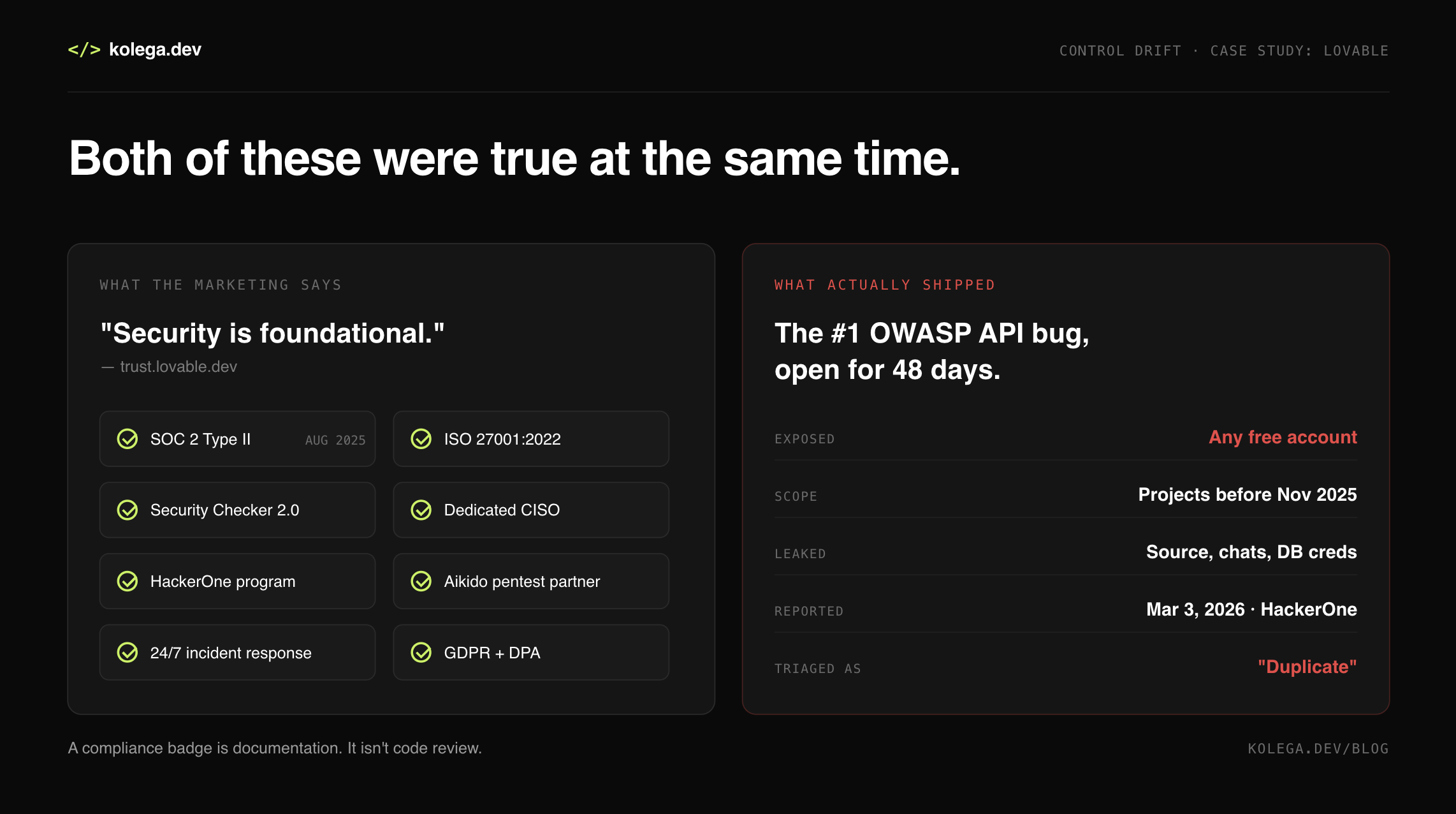 Lovable has a CISO, a SOC 2 Type II, an ISO 27001 certificate, a Security Checker, a partnership with a pen-testing firm announced seven days before this incident, and a 48-day-old HackerOne report for the most common API bug in the OWASP Top 10 sitting closed as a duplicate.