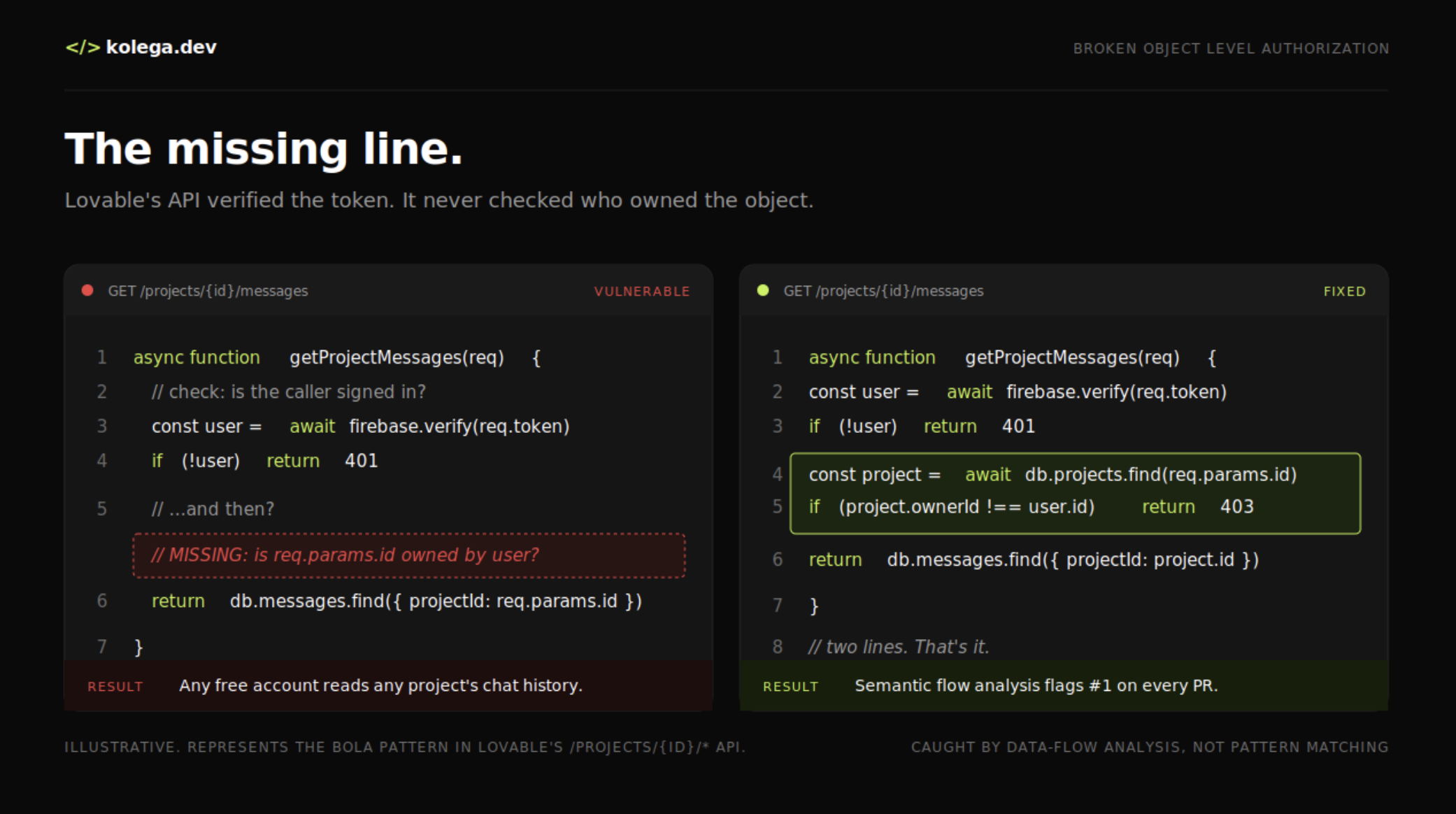 The flaw is a Broken Object Level Authorization bug. Lovable's /projects/{id}/* endpoints verified that you had a valid Firebase auth token. They just never checked whether that token belonged to the owner of the project you were asking about. BOLA is ranked number one on OWASP's API Security Top 10. It's the most common, most documented, most preventable API bug in existence.