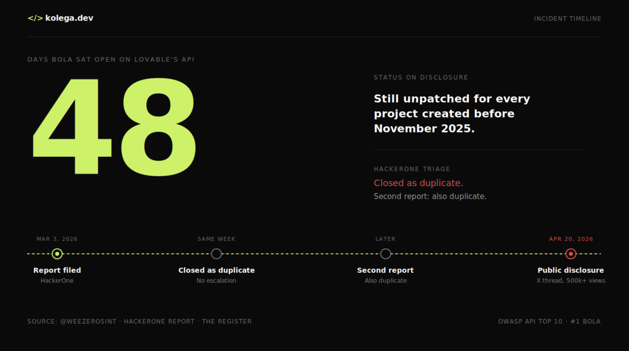 So the reports closed without escalation. Lovable added ownership checks to the API, but only for new projects. Every project created before November 2025 stayed exposed. When weezerOSINT filed a second report documenting additional affected endpoints, Lovable marked it a duplicate too.